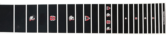 Width: 3” at nut end; 3 ½” at the 24th fret (7.62 cm & 8.9 cm) for 24” neck lengths. Note: If you own a ZB guitar, take a close look at your current board’s fret icons. You will likely discover that the black and red colors of those icons lack proper registry and sync. That lack of printing integrity between those two colors has been corrected on the boards I supply!