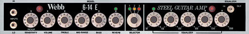 Only 2500 of these amps were manufactured. Most were sold before they were built, and it is difficult to find a used one for sale, with many players trying to obtain a second one! These players recognize that no other amplifier projects the steel guitar sound better than the Webb. With 225 watts of power, the most distant listener can hear the steel guitar with clarity in any setting. The back panel has a reverse polarity switch, courtesy AC power outlet, 2 speaker jacks, effects loop (pre-amp out, power amp in), and a line-out jack.